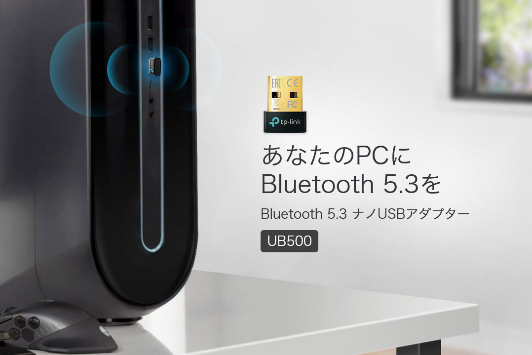 「TP-Link UB500」はUSBに差し込むだけでPCにBluetooth 5.3を追加できる商品で、ゲームコントローラー・ヘッドホン・キーボードなどのBluetooth対応デバイスとPCの間で、強力かつ安定したワイヤレス接続を実現してくれます。