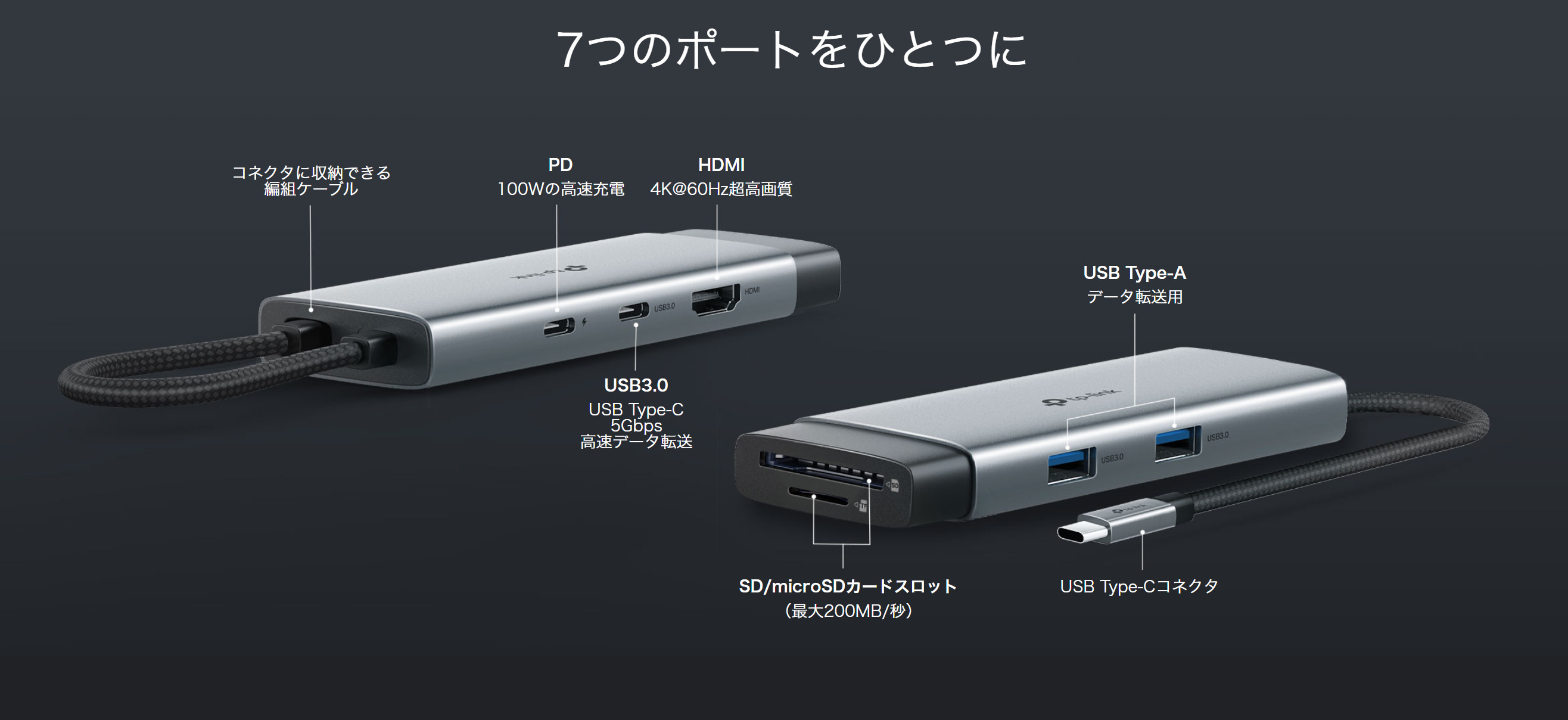 「TP-Link UH7020C」は小型ながら7in1の多機能なUSB Type-Cハブで、外部モニターへの出力からSDカードの読み取りまで様々なシーンで使えることや、USB Type-Aの拡張ポートも搭載されており、幅広い用途で活用できます。